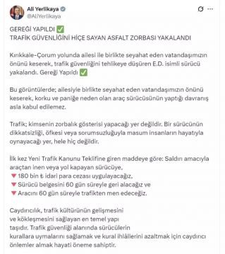 Bộ trưởng Nội vụ Ali Yerlikaya thông báo rằng tài xế E.D., người gây nguy hiểm cho an toàn giao thông bằng cách chặn một người dân đang đi cùng gia đình trên đường Kırıkkale-Çorum, đã bị bắt giữ. Ông Yerlikaya nhấn mạnh rằng hành vi như vậy là hoàn toàn không thể chấp nhận được và cung cấp thông tin về luật giao thông mới.